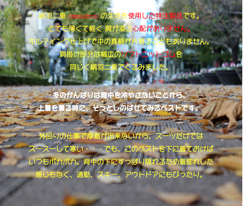 ② 軽くて柔らかく、しかもどんなに寒い日でもほどよい体温を保ち続ける保温性が抜群に優れている。肩こりもせず、1日の疲れをときほぐしてくれます。