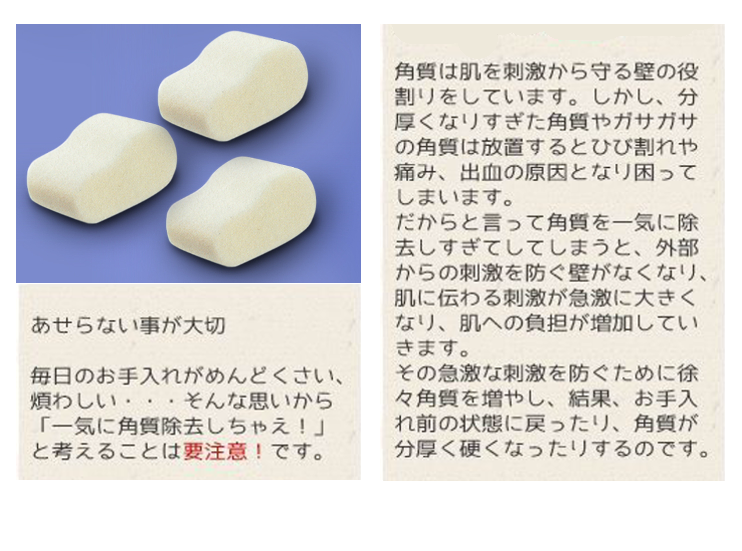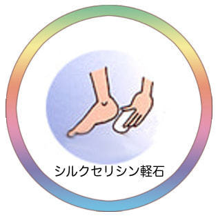 濃縮セリシンと牡蠣殻を原料とした天然抗菌剤「ハイセアーS」を硬質ウレタンに含浸させて発泡した商品です。かかとの古い角質層を除去してお肌に直接セリシンが働き、しっと り感を残しながらも、もち肌のようなつるつる感を残します。
