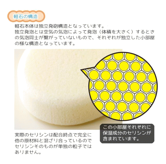 現在セリシンの人気に乗じて、セリシン使用と銘打った製品が多く流通していますが、すでに取り出されているフィブロインを利用したり、 薬品を使ったものも多いのです。イオン分解水で抽出された透明な高純度のシルクセリシンをたっぷり使った贅沢な軽石の使い心地をぜひ味わってみて下さい。