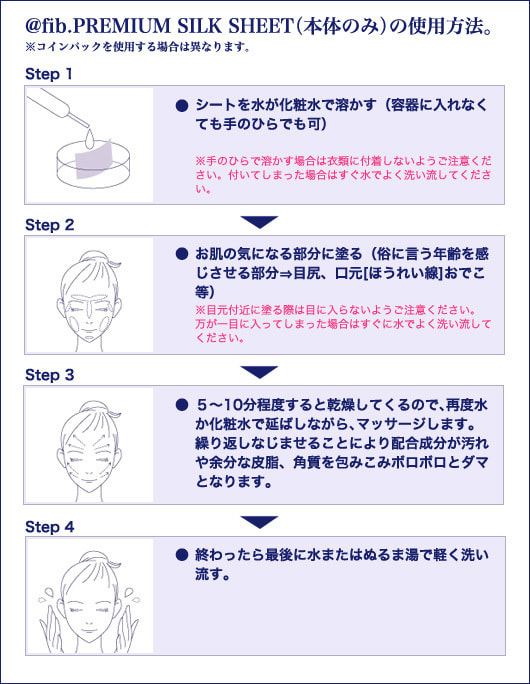 @fibプレミアムシルクシート(3枚入り・コインマスク付き)は完売いたしました。コインマスクをお使いになってこられた場合は、代わりに「シルク100%のフェイス&ネックシート」(下段)をご紹介いたします。マスクなしでのご使用が本来なのですが、多くのご希望を取り入れました。