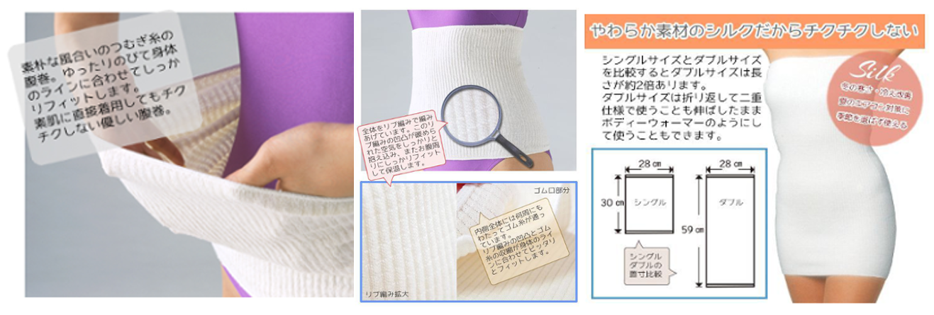 ●素材混率:シルク95%・コットン4%・ポリウレタン1%---腹巻としてのフィット感を作るために必要なポリウレタンを、コットンでカバーリング(外巻き)した特殊糸を使用しています。