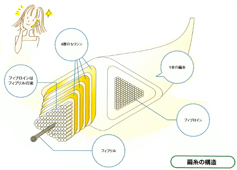 また、シルクの組成のチロシンは、紫外線を吸収するともいわれ、美肌ブームの今、注目されています。白い絹布が黄変しやすいのは、紫外線を吸収するからなんですね。