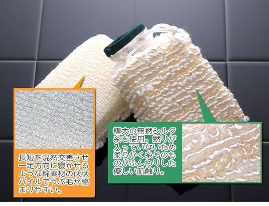 シルクパイルで汚れや毛穴に残った角質を、綿パイルで皮脂を洗浄しながらうぶ毛を除去するという、素材の違いで異なる効果が期待できます。シルクのアミノ酸タンパク質の保湿力がお肌のしっとり感をキープして乾燥から守ることはよく知られていますが、新素材の綿の基布に2種類の最高級シルク繊維を植毛したマッサージ効果でお肌のくすみを抑え、あなたのお肌を美しく磨き上げてください。