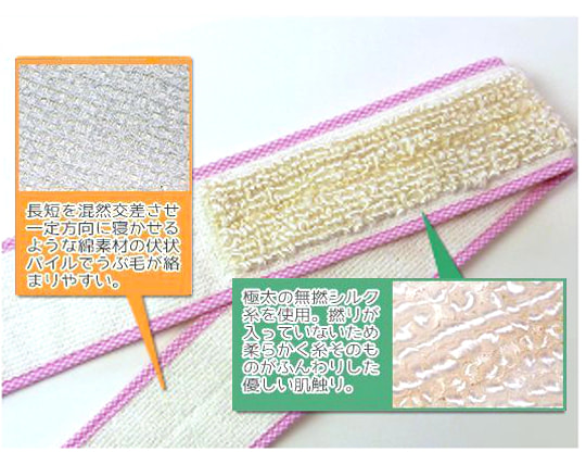 ミクロ繊維で断面が三角形状しているシルクはお肌の角質や老廃物を取り除いたりザラつきを防ぎ、新陳代謝を活発にし、18種類のアミノ酸で組成されタンパク繊維はお肌になじみやすく低刺激 です。